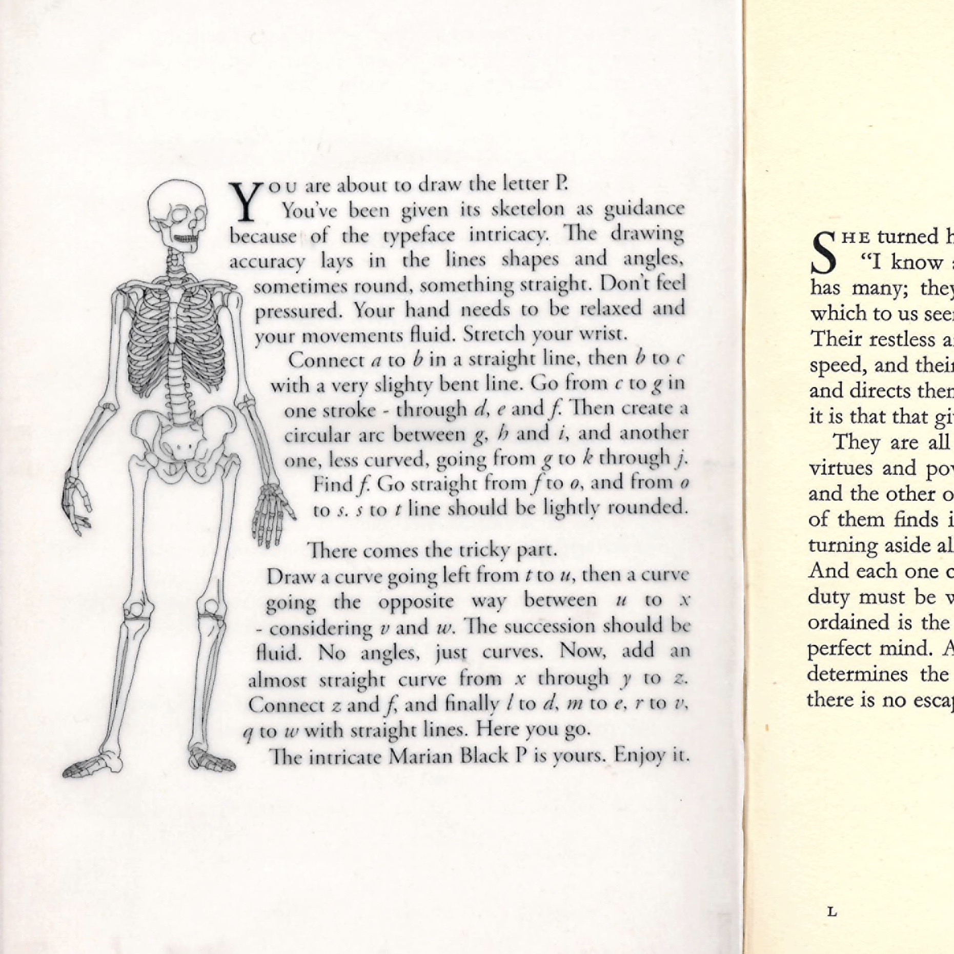 set of instructions written for someone to draw the P from the Marian Black font without looking at it. Marian Black being the strange merge of various book faces, my instructions are displayed in a novel (Les Nourritures Terrestres) d’André Gide, itself using Garamond. the skeleton is a reference to the structure of the font.